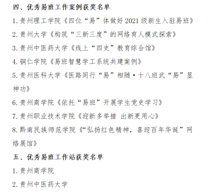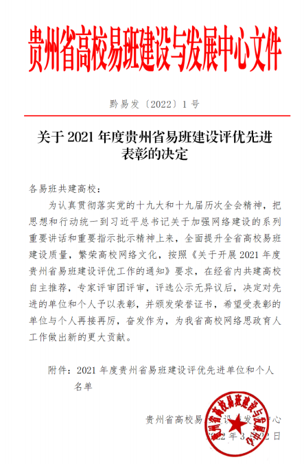 为认真贯彻落实党的十九大和十九届历次全会精神,践行习近平总书记关于加强网络建设的重要讲话精神和重要指示批示精神,我校高度重视网络思政工作,持续提升我校易班工作站建设质量。在本次由贵州省高校易班建设与发展中心组织开展的2021年度全省易班建设评优活动中,我校推荐的工作案例《依托“易班”网络思政平台开展学生党史学习教育》脱颖而出,荣获全省“优秀易班工作案例”,被推荐参加全国优秀工作案例的评选。我校易班工作站同时获得“全省优秀易班工作站”荣誉称号。