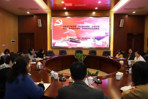 2021年3月26日上午,大学外语教学部(国际教育学院)党总支在湖滨会议中心会议室召开党史学习教育暨“牢记殷切嘱托、忠诚干净担当、喜迎建党百年”专题教育动员部署会。会议由党总支书记严勇主持,副书记徐琴、副院长汪阳及全体教职工参加会议。