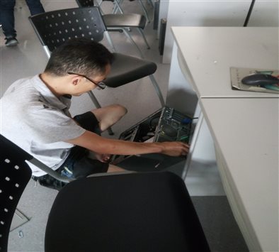 实践教学中心为了在新的学期里,能够更好为全校师生提供稳定良好的设备运行状态,赵模江老师带领顶岗实习的同学对尚能楼的所有实验设备进行了排查和检修,尽力做好技术保障服务工作。