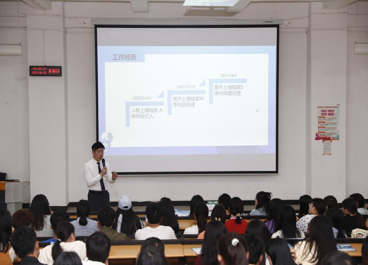4月20日晚19点,人力资源管理专业的同学在尚智楼3J201参加了人力资源管理专业优秀学子引航讲座。本次讲座以“贵商人力学子在上海链家的快速成长”为主题,由本校毕业生人力资源管理2016-1班班长贺鹏程作为主讲人,蒙慧教授担任讲座主持人。