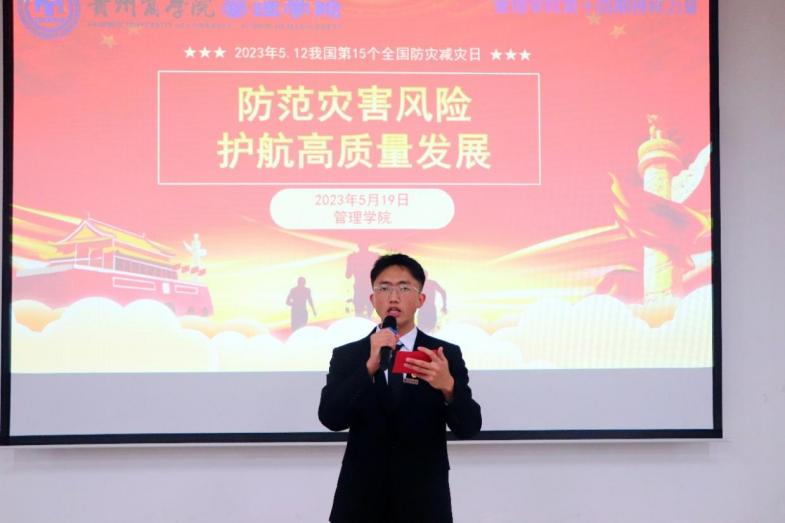 2023年5月12日是我国第15个全国防灾减灾日。为了加强同学们防范灾害风险的意识,了解更多的应急逃生知识,提升应对突发情况的技能,进一步加强平安社区建设。管理学院于2023年5月19日在3j204教室开展了“防范灾害风险,护航高质量发展”第十四期榜样力量宣讲活动,本次宣讲由管理学院五位榜样学子带领大家学习防灾减灾知识,并分享自己的感悟。