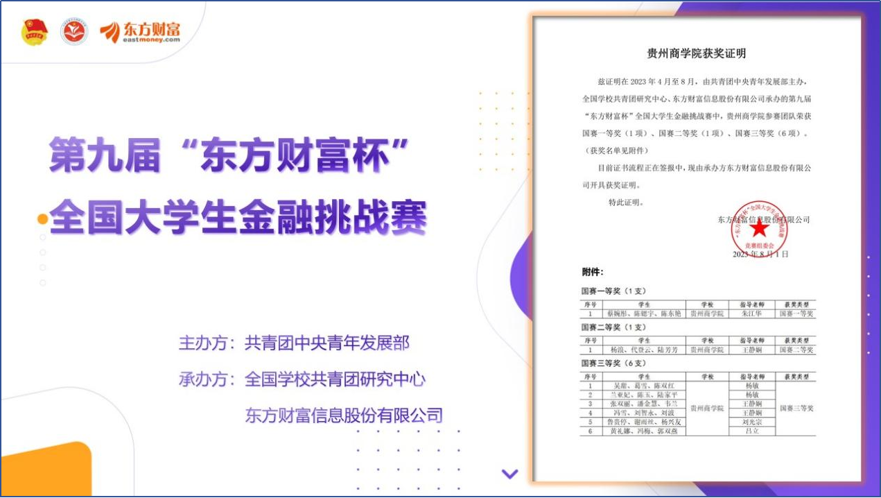 近日,由共青团中央青年发展部主办,全国学校共青团研究中心、东方财富信息股份有限公司承办的第九届“东方财富杯”全国大学生金融挑战赛,在激烈的角逐和精彩的表现中完美收官!经过历时3个月校赛、省赛和国赛的激烈比拼,最终我校学生脱颖而出,一路披荆斩棘荣获国家级奖项并突破新高。其中,管院学子荣获国赛一等奖1项,国赛三等奖6项,省赛一等奖5项,省赛二等奖19项,省赛三等奖28项。