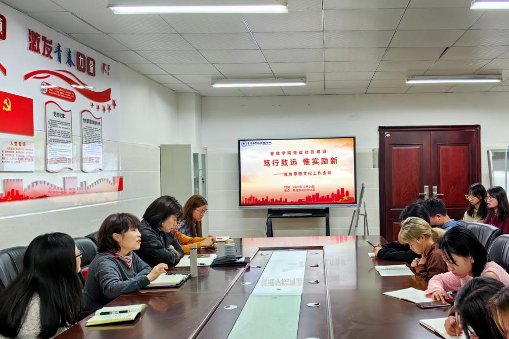 为加强学院宣传思想文化工作的内涵建设,提升新闻舆论传播力、引导力、影响力、公信力,打造具有凝聚力和引领力的宣传工作队伍,管理学院于2023年10月24日在丹桂苑A区“青蓝致远”学生社区活动室开展了“青蓝茶叙”第53期-宣传思想文化工作交流。管理学院党总支书记田歆、副处级组织员张艳丽、团总支书记肖立容以及全体学生社区宣传工作成员参加了交流会。