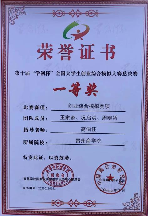 在总决赛中,由管理学院王家家、况启洪同学、会计学院周晓娇同学组成的团队荣获国家级一等奖。