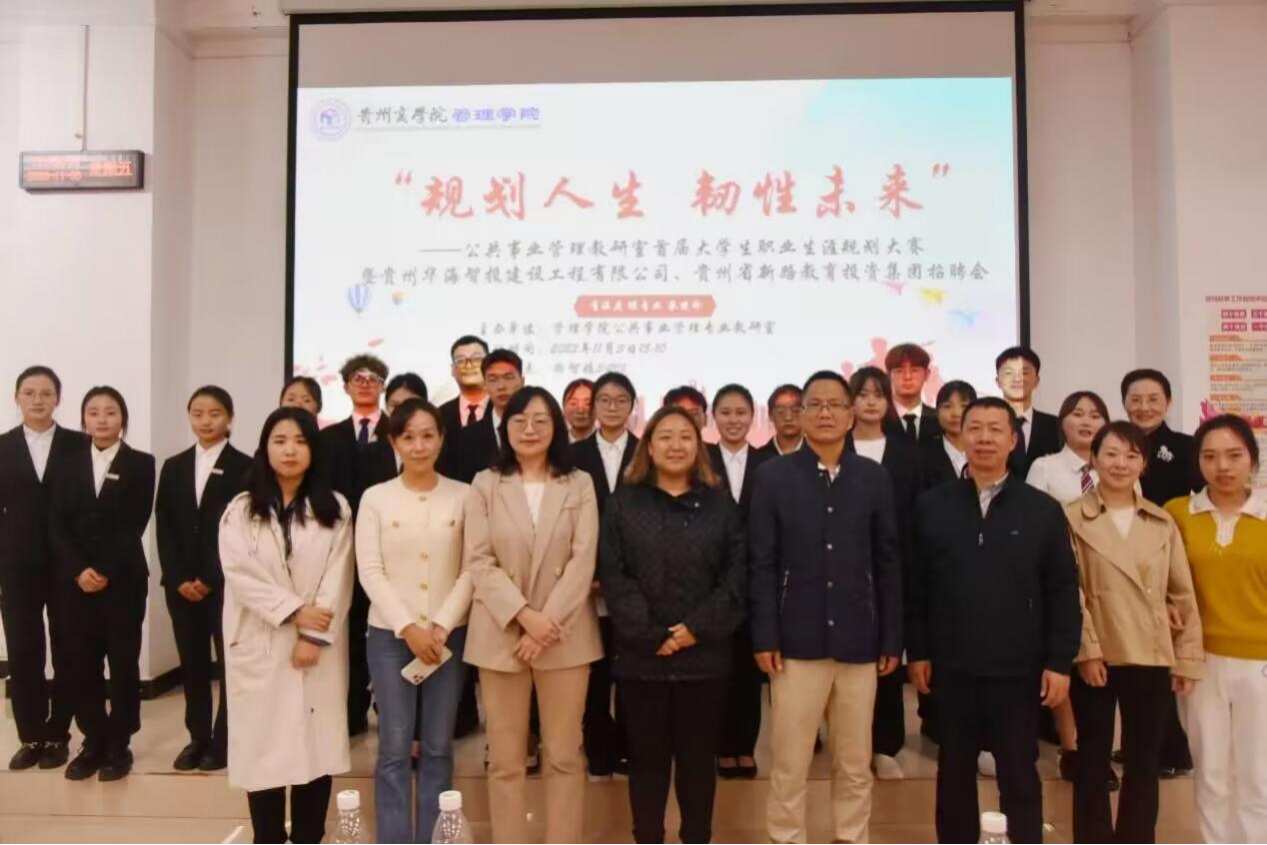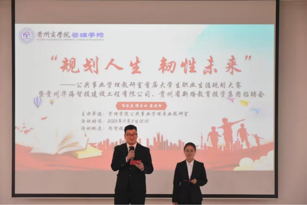 为了积极推进大学生职业生涯规划教育,帮助同学们在未来就业和创业中做好充分的准备,管理学院公共事业管理教研室于2023年11月3日在尚智楼3J201举行“规划人生,韧性未来”首届大学生职业生涯规划大赛。本次活动由公共事业管理20-1班王德旭同学和公共事业管理21-1班李洋同学主持,贵州华海智投建设工程有限公司副总经理冷鸽子、人事主管李烨,金沙县新时代综合实践教育营地校长唐炎煜及公共事业管理教研室老师、班级辅导员等出席本次活动。