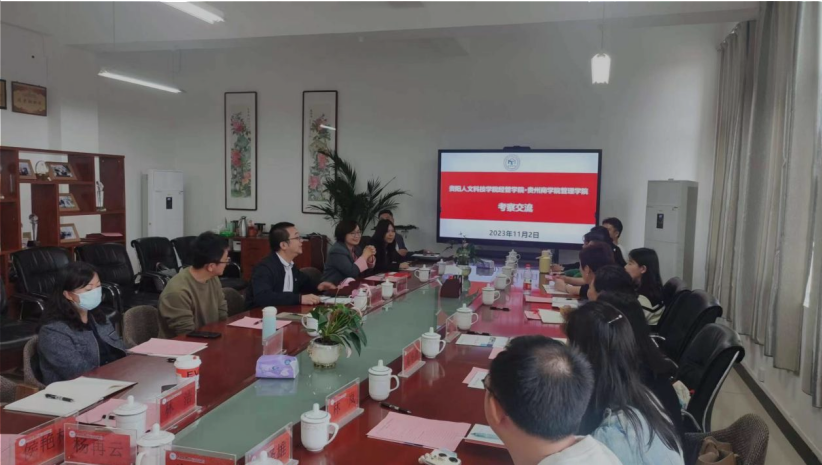 11月2日,贵阳人文科技学院经济管理学院副院长陈福娣率领其财务管理、电子商务、行政管理、市场营销、人力资源管理、房地产开发与管理、数字经济的各专业负责人一行12人到管理学院开展了交流活动。管理学院副院长曾方俊、市场营销和人力资源管理专业教研室负责人、管理学院教科办负责人、部分教师代表出席交流活动。