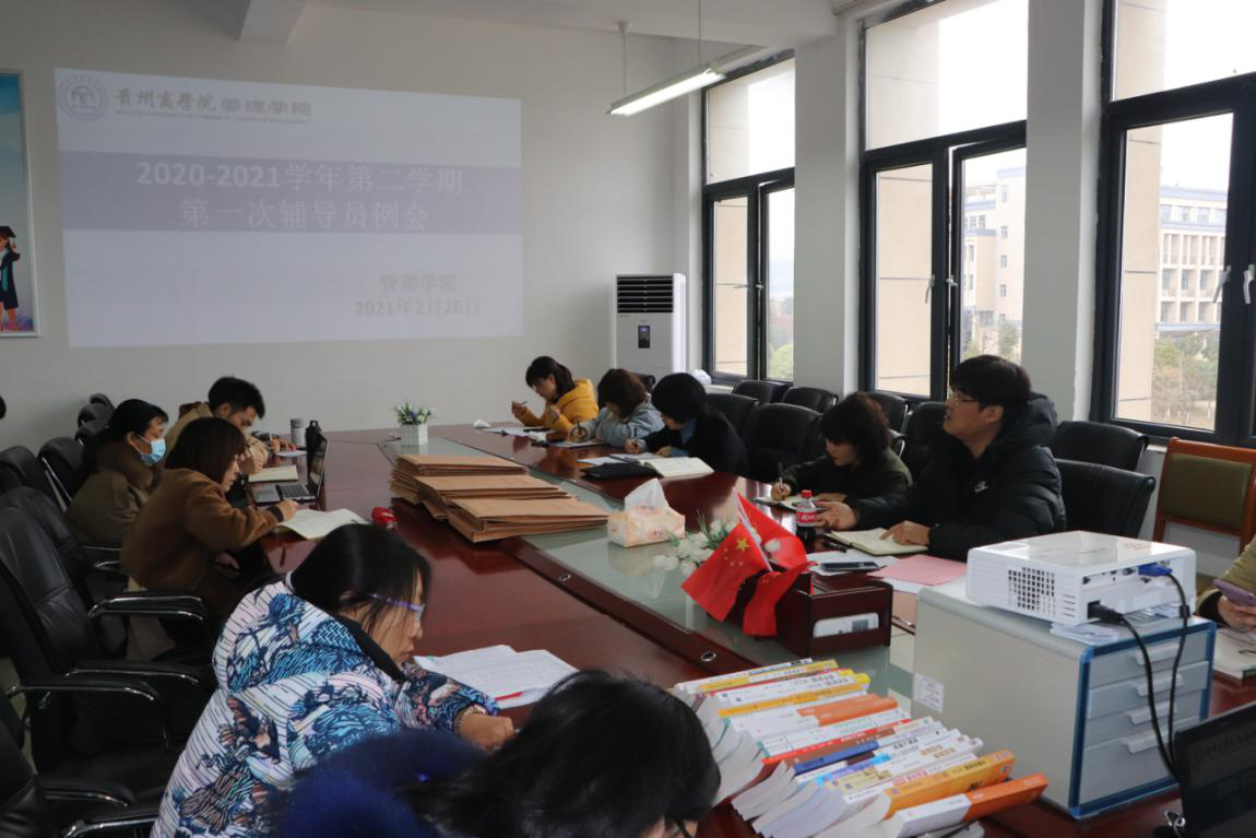 2021年2月26日上午11点,管理学院在尚信楼412会议室召开了2021年第一次学生工作例会。学院党总支书记田歆、党总支副书记赵翔出席会议,全体辅导员参会,会议由党总支副书记赵翔主持。