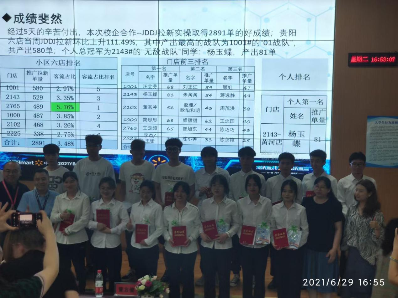 6月29日,沃尔玛(贵州)商业零售有限公司总经理率管理团队16人到我校成绩管理学院市场营销专业的沃尔玛(贵州)——京东到家校企合作项目《市场调研实践》结训仪式, 为市场营销专业2019级112位学生为沃尔玛产品在线推广活动和贵阳市六大门店周边商圈需求及竞争调研的优胜团队和个人颁奖。