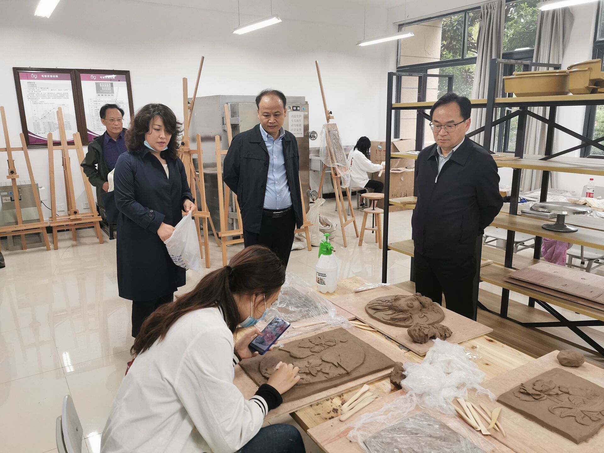 5月28日,院党委书记方仕平和院长罗兵率有关职能部门负责人来到新落成的bwin必赢文化与艺术教育中心调研并看望慰问教职工。方仕平与罗兵查看了文化创意产品设计工作室、版画工艺实验室、染艺实验室、陶艺实验室、数字媒体设计工作室等实验教学场地及设备,对文化与艺术教育中心的建设及投入使用的情况表示肯定。方仕平与与罗兵走进一线课堂,在陶艺实验室视觉传达设计专业泥塑课程教学现场,就返校复课情况、线上线下课程衔接情况、校舍的防疫保护措施等相关的问题与师生进行切实深入交流。