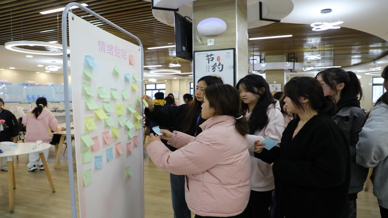 “情绪贴贴”互动墙成为活动的又一亮点。师生们在彩色便利贴上写下“吃甜品的心情”或“想对自己、他人说的一句话”,贴满整面白板。有同学写下“人生先苦,方知甜真”,送给奋斗中的自己;也有人写下“希望每天都能发现一个小美好”。主持人赵珂、罗英带头分享“谢谢今天勇敢微笑的自己”,让现场充满真情与共鸣。温暖的字句汇聚成情绪的彩虹,让大家真切感受到——情绪被看见,本身就是一种疗愈。