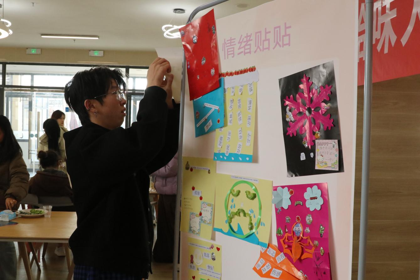 “情绪解构·拼贴治愈墙”让活动从热烈走向柔软。参与者挑选代表自身处境的“苦味符号贴”,如“解不开的数学题”“竞选落选的失落”“学业压力”等,再用亮片、笑脸贴、励志短句等“甜元素”为这些“苦味”重新装点:有人在“迷茫”旁贴上象征清晨阳光的亮片,有人在“压力”旁添加“朋友的拥抱”贴纸,也有人写下鼓励自己的心声。杨玺强调,人生的味道,不止甜一种。苦,让我们更懂得甜的珍贵,也让我们在沉淀中,看清自己真正的力量。最终,所有作品汇聚成一面色彩斑斓的“情绪贴贴墙”,同学们还用“甜评便利贴”为他人留言:“公交再挤,也能看见窗外的云呀”“你的认真闪着光”。在创作与互评之间,情绪得以表达,支持悄然流动,分散的心绪被串联成一份柔软的集体力量。