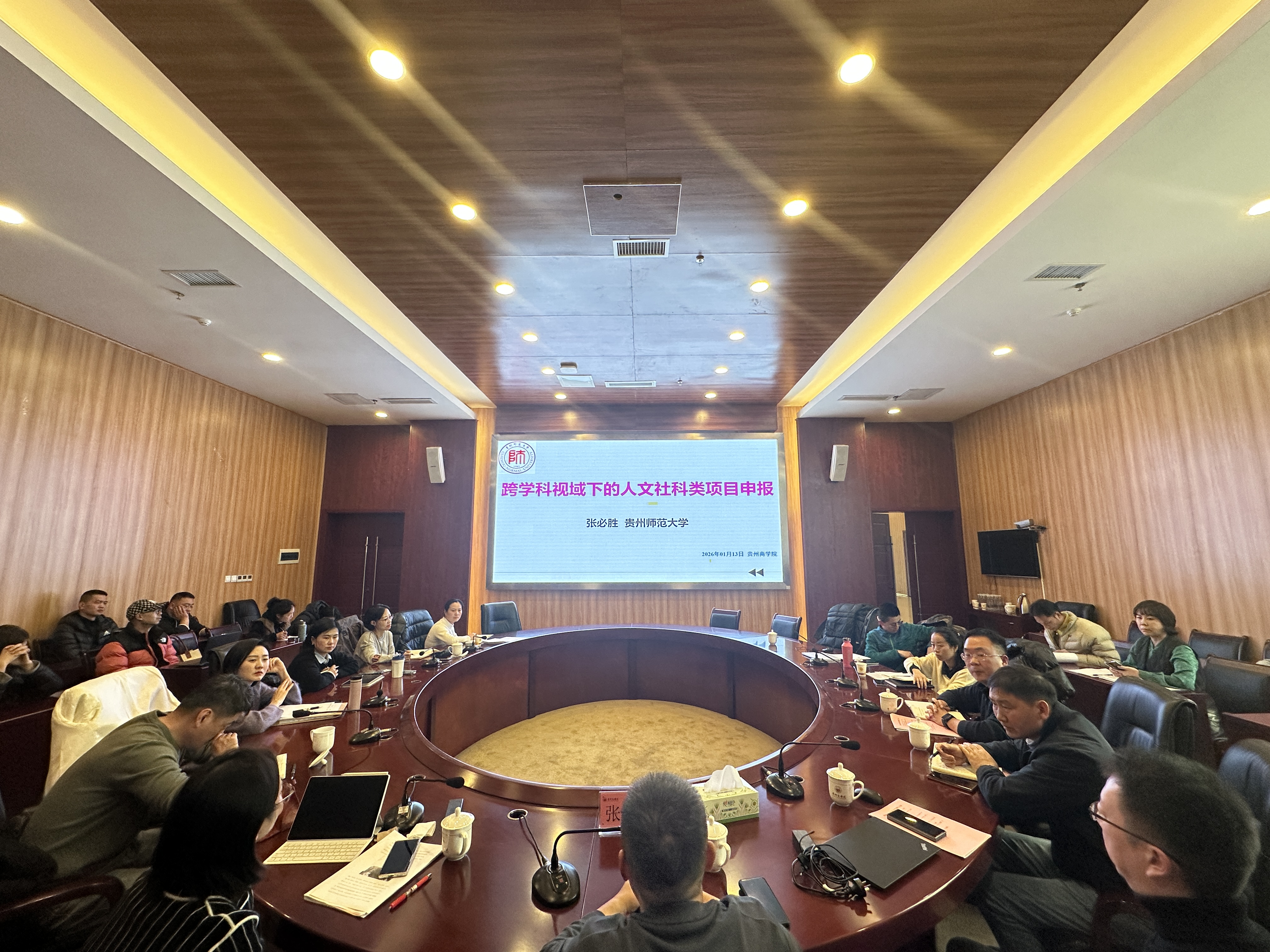 会议特邀贵州师范大学博士生导师张必胜教授担任主讲嘉宾。张教授长期深耕科学史、翻译史、思想史、教育史等领域研究,学术积淀深厚,近年来主持多项国家社会科学基金年度项目,具备丰富的项目申报与研究实践经验。通识教育学院班子成员、副高以上职称教师、高层次人才及中青年教师踊跃参会,马克思主义学院、国际教育学院的部分高层次人才也受邀齐聚一堂,共同参与了此次学术盛宴。会议由院长汪阳主持。